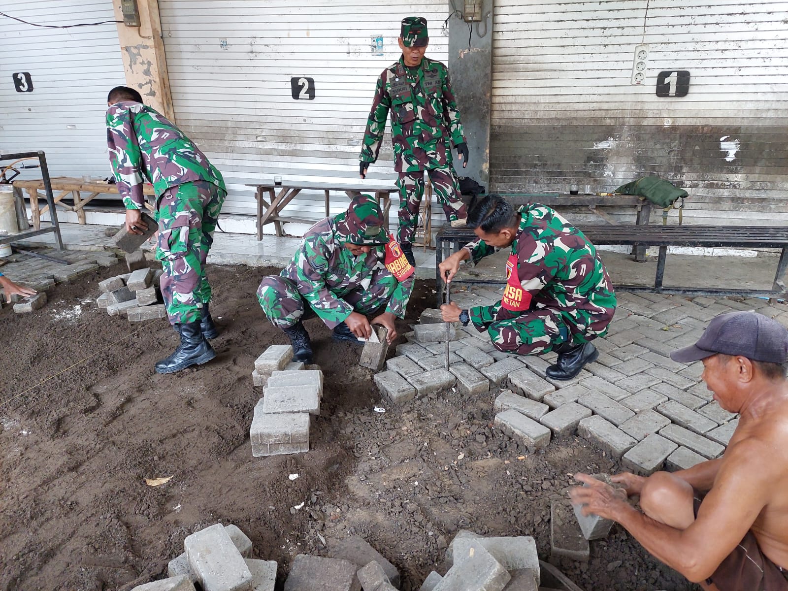 Anggota TNI dari Koramil 0812/02 Deket bantu warga Pasang Paving