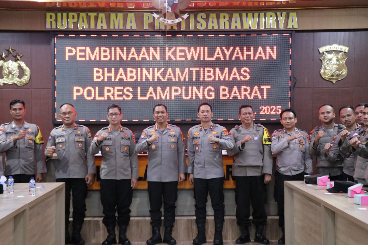 Tipikorinvestigasinews.id Lampung Barat — Pada Jumat, 25 April 2025, pukul 09.30 WIB, bertempat di Rupatama Polres Lampung Barat, telah dilaksanakan kegiatan Pembinaan Kewilayahan Bhabinkamtibmas jajaran Polres Lampung Barat oleh tim dari Ditbinmas Polda Lampung, yang dipimpin oleh Dir Binmas Polda Lampung Kombes Pol. V. Thirdy Haposan, S.I.K., M.A.P.