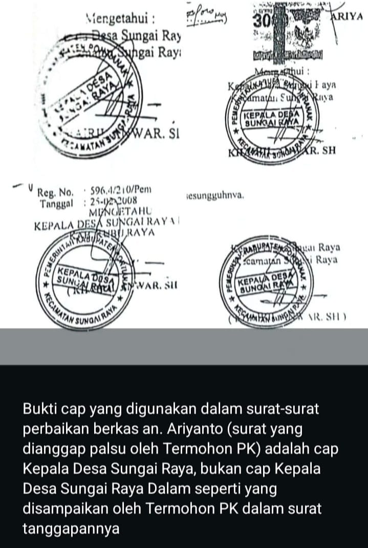 Salah satu inti keberatan dari pihak Pemohon adalah dalil Termohon yang menyatakan surat-surat yang digunakan oleh Pemohon merupakan hasil pemalsuan dengan menggunakan cap Kepala Desa Sungai Raya Dalam. Padahal, bukti fisik dari dokumen yang diajukan menunjukkan tidak terdapat cap tersebut, melainkan cap resmi Kepala Desa Sungai Raya yang sesuai dengan tanggal surat, yakni 25 Februari 2008.