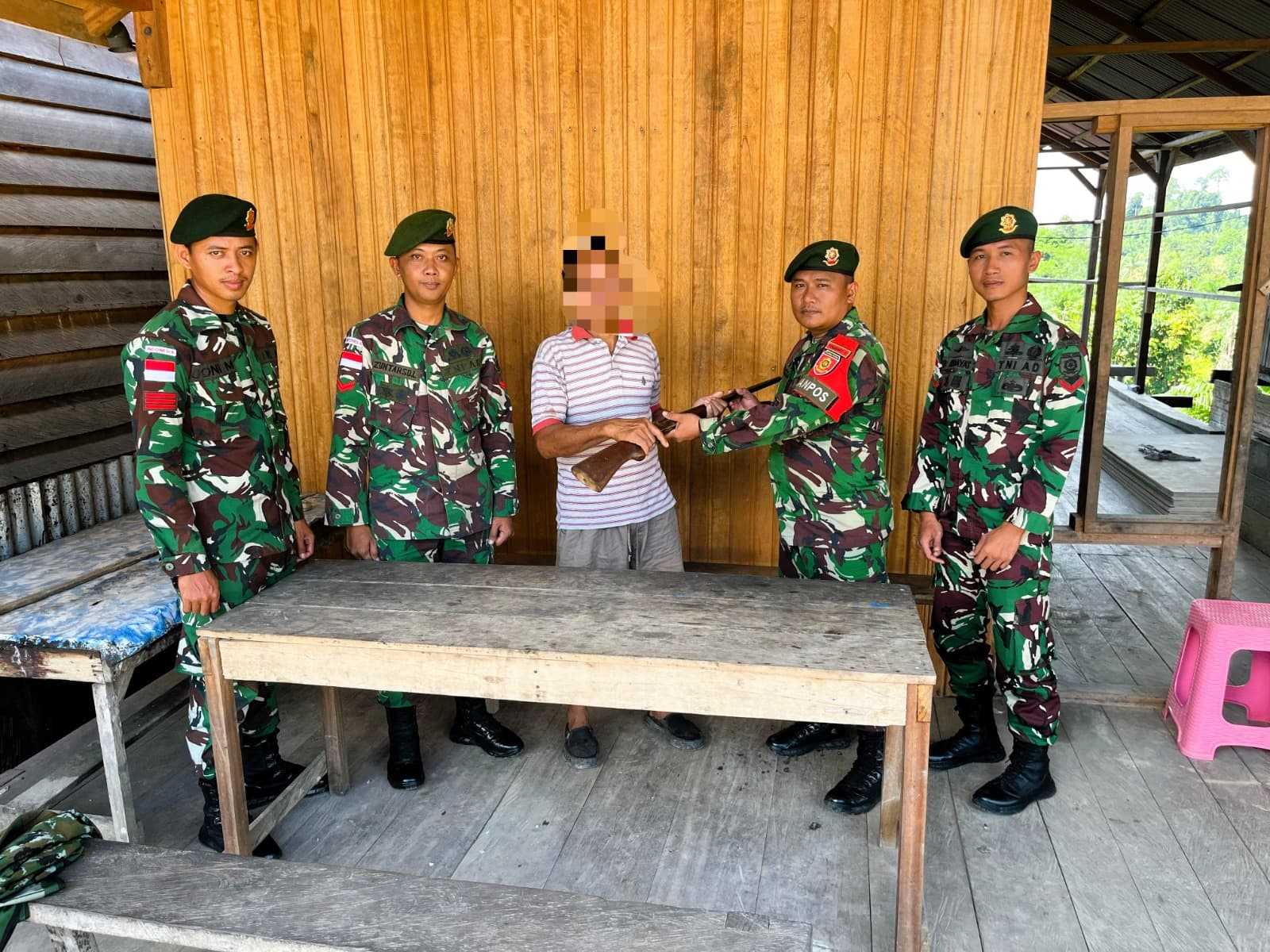 Penyerahan senjata tersebut dilakukan secara sukarela sebagai bentuk kesadaran dan dukungan warga terhadap terciptanya situasi keamanan yang kondusif di wilayah perbatasan.